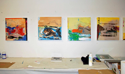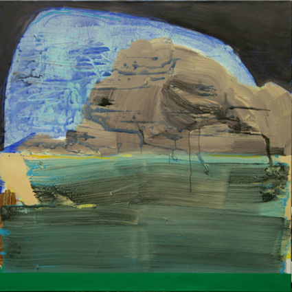 It must have been one of those days. The water of the Rhine appears mysteriously dark green when the flood streams carry the force of melting ice from the mountains. Bold brush strokes correspond to the water’s current. A slate grey rock rises above it. One on which the famous Riesling wine grows. We recognize at the same time geological structure and a sublime landscape. Above all blue, a blue which suggests glimpses of hope like the blue flower associated with German Romanticism? Small delicate traces appear on boldly applied layers of colour, crevices which seem to force their way through the pigment. Almost as if a second layer develops from the structure revealing deeper levels and underlying characteristics of the landscape. Possibly referring to secret myths, which are told about the Rhine. This described picture belongs to a series of paintings and drawings which originated from the now firmly established collaboration between Pete Clarke and Georg Gartz. The series dates from May 2007 when the two artists traced the famous William Turner who almost 200 years ago travelled along the Rhine. He himself was following in the footsteps of Lord Byron, who in 1816 praised the paths along the Rhine in ‘Child Harold’s Pilgrimage’ and subsequently caused European wide enthusiasm for this landscape. It almost seems inevitable that Pete Clarke and Georg Gartz embarked on this journey, for their research they revisited locations where Turner could have been and worked. This is Art History alive! It is not merely the joint travels that bring Gartz and Clarke together, underlying this project are formal visual enquiries (soon they will continue to follow the trail of Turner’s journeys throughout Europe!!). In their collaborative work they set themselves the task to investigate particular locations artistically, describing places, determining views, clarifying perspectives – similar to previous projects in Liverpool and Cologne. Their abstracted paintings attempt to make sense of the world, the viewer is never left alone, and there are always reference points within the play of colour and the finely drawn lines. As in previous projects the artists explore the theme of the Rhine collaboratively deriving new impulses for their art from Turner’s sense of colour and the Rhine landscape which like no other inspires to dream. Anke von Heyl, Kunsthistorikerin, Köln
